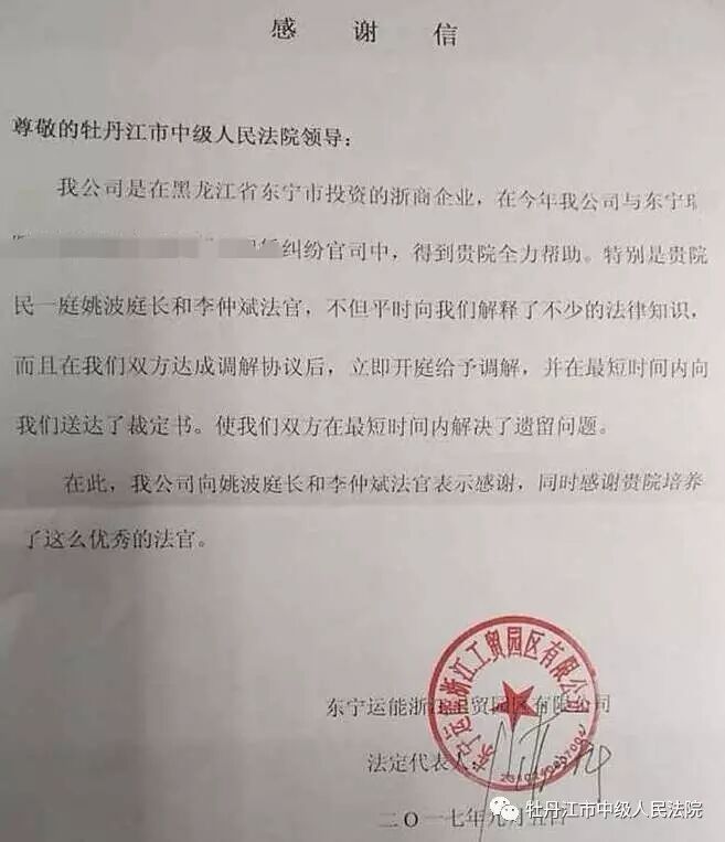 近日,牡丹江中院民一庭收到了一封来自东宁某公司的感谢信,当事人对中院民一庭优质高效的司法服务表示感谢。