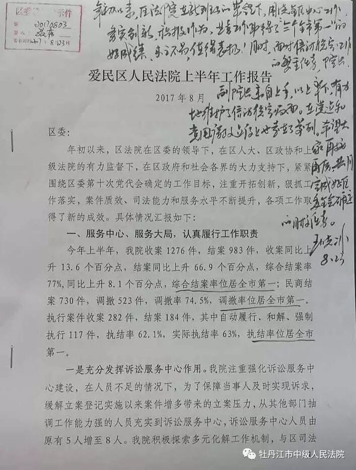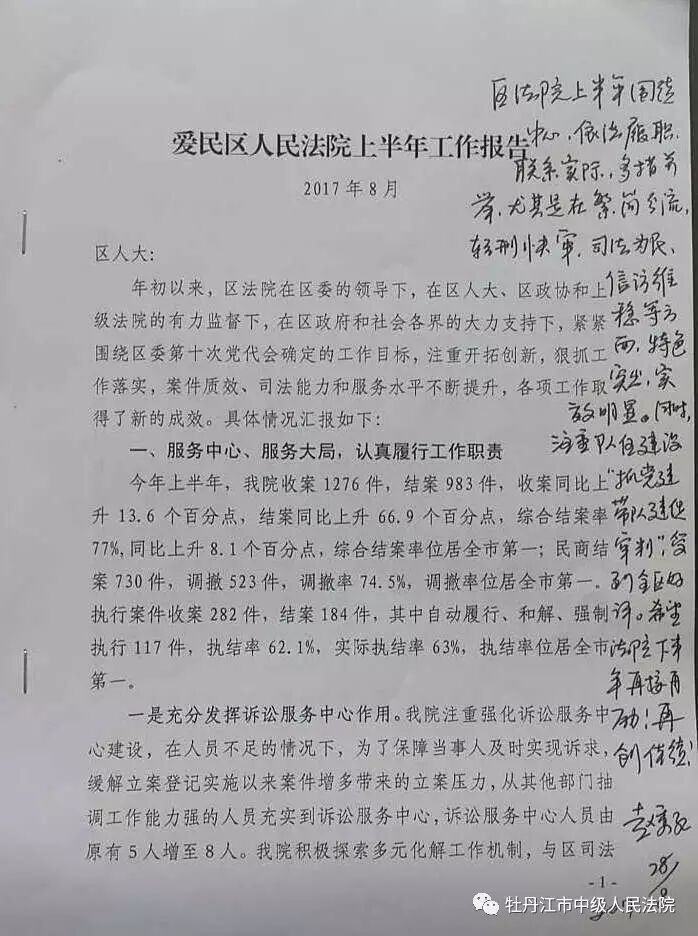 爱民区人大主任赵秀红在爱民区法院呈报的《爱民区人民法院上半年工作报告》上作出批示:区法院上半年围绕中心,依法履职,联系实际,多措并举,尤其是在繁简分流、轻刑快审、司法为民、信访维稳等方面,特色突出,实效明显。同时注重队伍建设,“抓党建带队建促审判”受到全区好评。希望法院下半年再接再厉!再创佳绩!