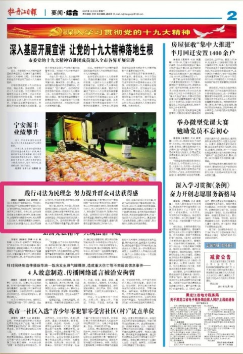 12月5日,牡丹江电视台《新闻联播》栏目及《牡丹江日报》对中院“弘扬宪法精神 感受公平正义”宪法日新闻发布会进行了报道。