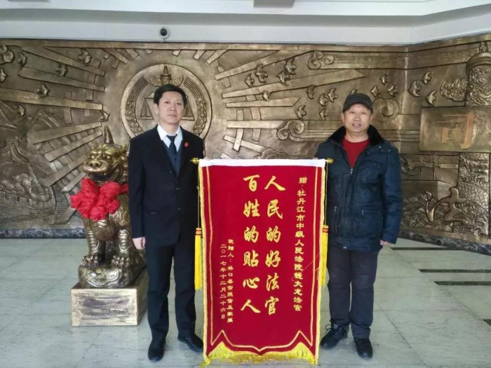 2017年12月28日一大早,年过花甲的宫老伯冒着零下二十几度的严寒从林口县来到牡丹江中院,只为给他和家人心中的好法官钱大龙送来一面锦旗,以表对他的感谢之意。