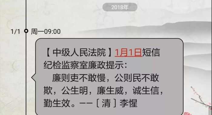 新年伊始,牡丹江市两级法院每名干警都收到了1份特殊的“礼物”——廉政短信。这是牡丹江中院加强廉政思想教育宣传,践行中央“八项规定”和反“四风”活动的常态化举措。为深入贯彻党的十九大精神和习近平总书记关于进一步纠正“四风”、加强作风建设重要批示精神,再次敲响了节日“廉洁警钟”。