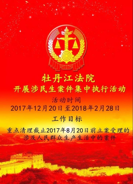 为深入贯彻落实党的十九大精神,践行全心全意为人民服务的根本宗旨,切实保护农民工、生活极端困难群众等弱势群体利益,按照最高院、省法院的部署,近日,牡丹江法院开展了涉民生案件集中执行活动。