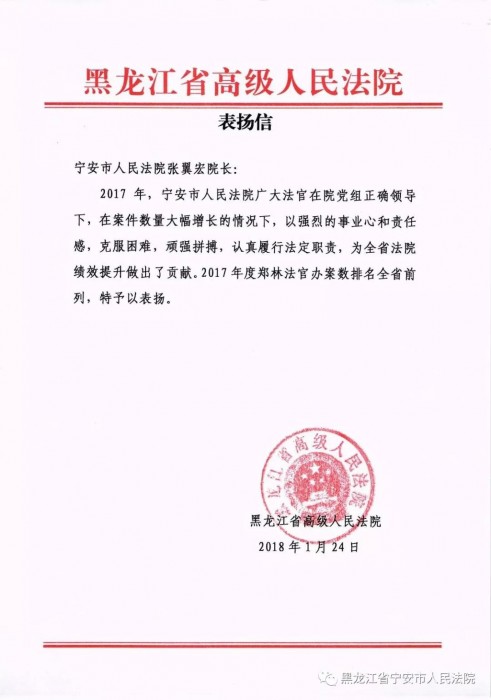 黑龙江省高级人民法院表扬信中指出,宁安市人民法院广大法官在院党组正确领导下,在案件数量大幅增长的情况下,以强烈的事业心和责任感,克服困难,顽强拼搏,认真履行法定职责,为全省法院绩效提升做出了贡献。2017年度郑林法官办案数排名全省前列,特予以表扬。