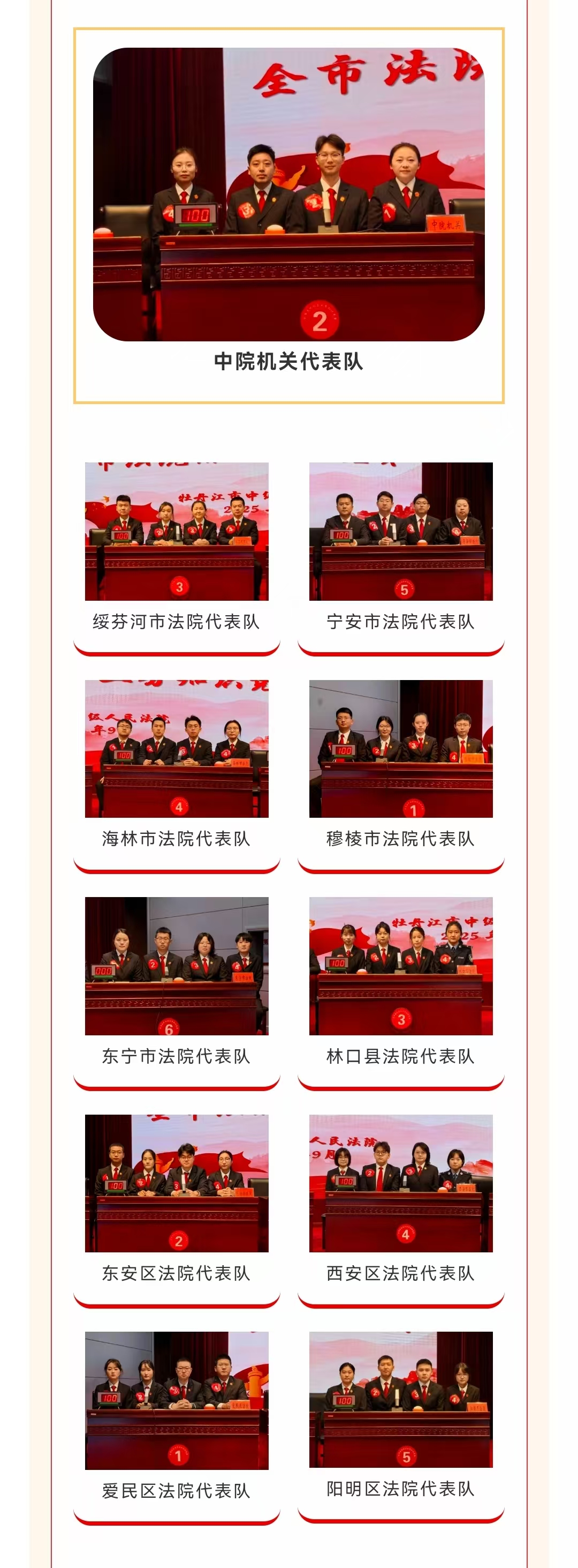 9月12日,牡丹江中院举办选拔赛,通过闭卷考试形式选取四名成绩优异的干警组成中院机关代表队,10家基层法院经过选拔,各派出一支代表队参赛。