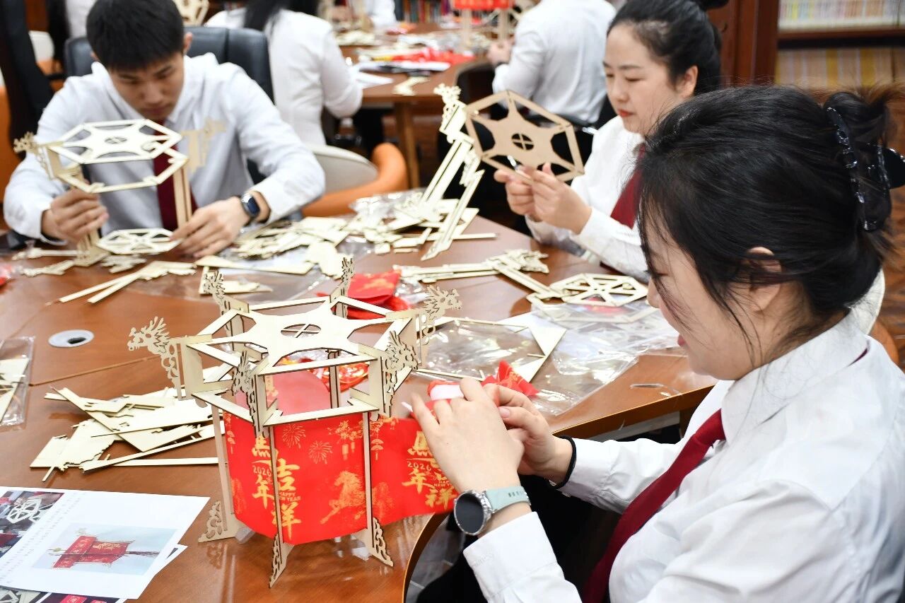 红色的绸布、木质的骨架、喜庆的流苏铺满桌面,干警们纷纷化身认真专注的“手艺人”,互相配合,齐心协力完成拼骨架、粘布料、穿灯珠、上流苏等步骤。